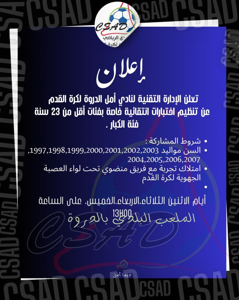 إذا كنت لاعباً طموحاً من جهة الدروة أو المناطق المجاورة، فهذه فرصتك الذهبية لتمثيل فريق CSAD والمضي في طريق الاحتراف. تابع الصفحة الرسمية للنادي لمزيد من المعلومات والمستجدات الخاصة بالفئات الصغرى.