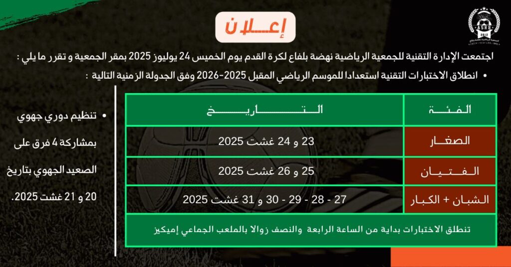 📌 ختامًا، إذا كنت شغوفًا بكرة القدم وتطمح لإبراز موهبتك، فإن اختبارات نادي نهضة بلفاع موسم 2025-2026 هي فرصتك الذهبية. حضّر نفسك جيدًا، والتزم بالنصائح، وكن مستعدًا لخطوة قد تغيّر مسارك الرياضي نحو الأفضل.