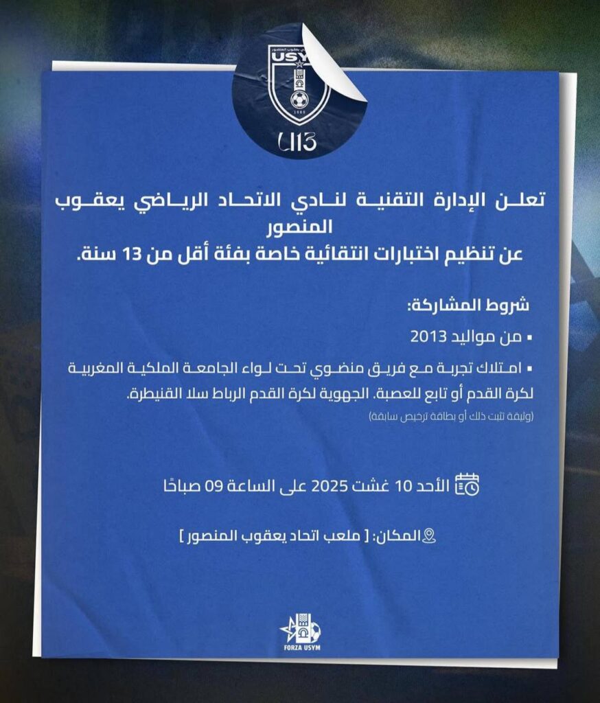 بهذه المعلومات، ستكون على أتم استعداد لخوض اختبارات نادي الاتحاد الرياضي يعقوب المنصور 2025-2026، وربما تبدأ من هنا رحلتك نحو الاحتراف في كرة القدم.
